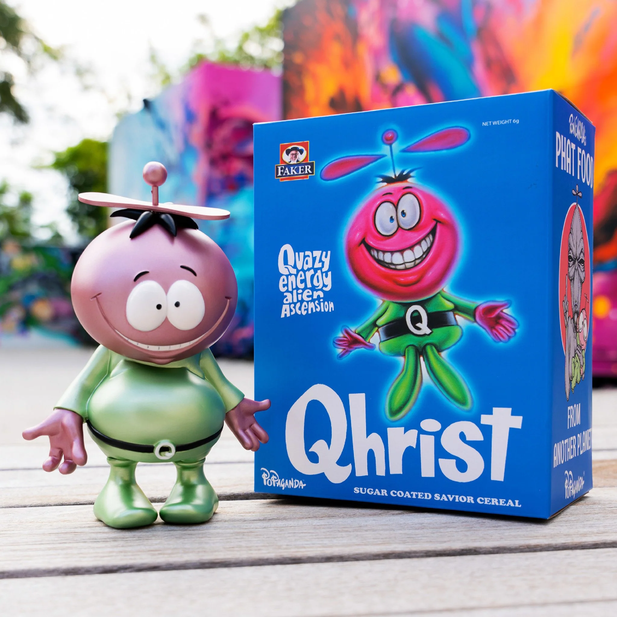 Become part of a larger narrative with the Cereal Killers figure series. By adding the Qhrist Metallic to your collection, you're not just acquiring a toy but a piece of Ron English's bold statement on contemporary culture. Join Qhrist, the vibrant energy alien, as he makes his mark in this iconic series, symbolizing both playful imagination and poignant social commentary.