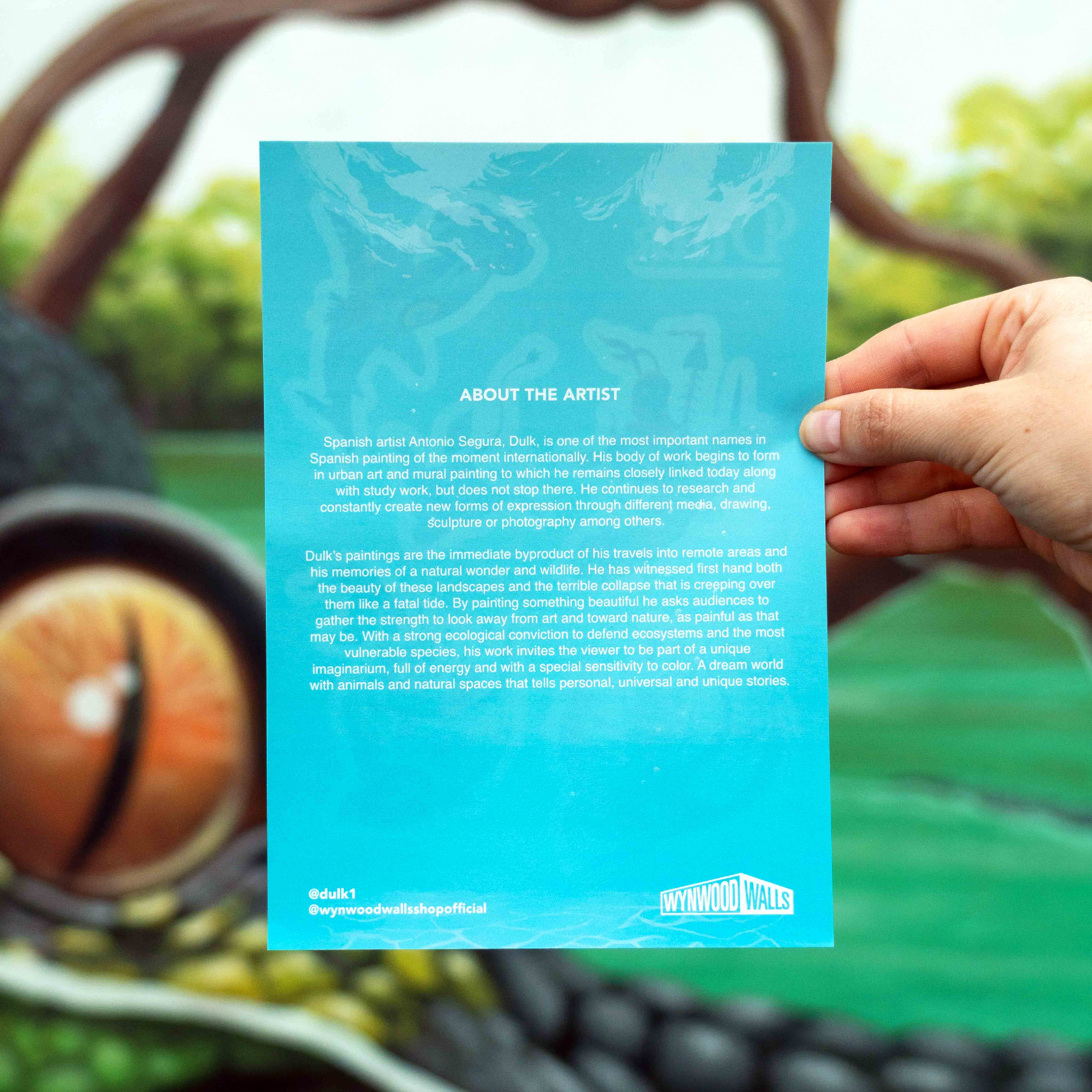 Dulk (Antonio Segura) is a Spanish multidisciplinary artist celebrated for his dreamlike, ecologically charged landscapes and hybrid animals. His work spans murals, gallery art, and sculpture, often exploring the tension between human progress and the natural world. His murals have adorned streets and museums across the globe, from Miami to Europe.
