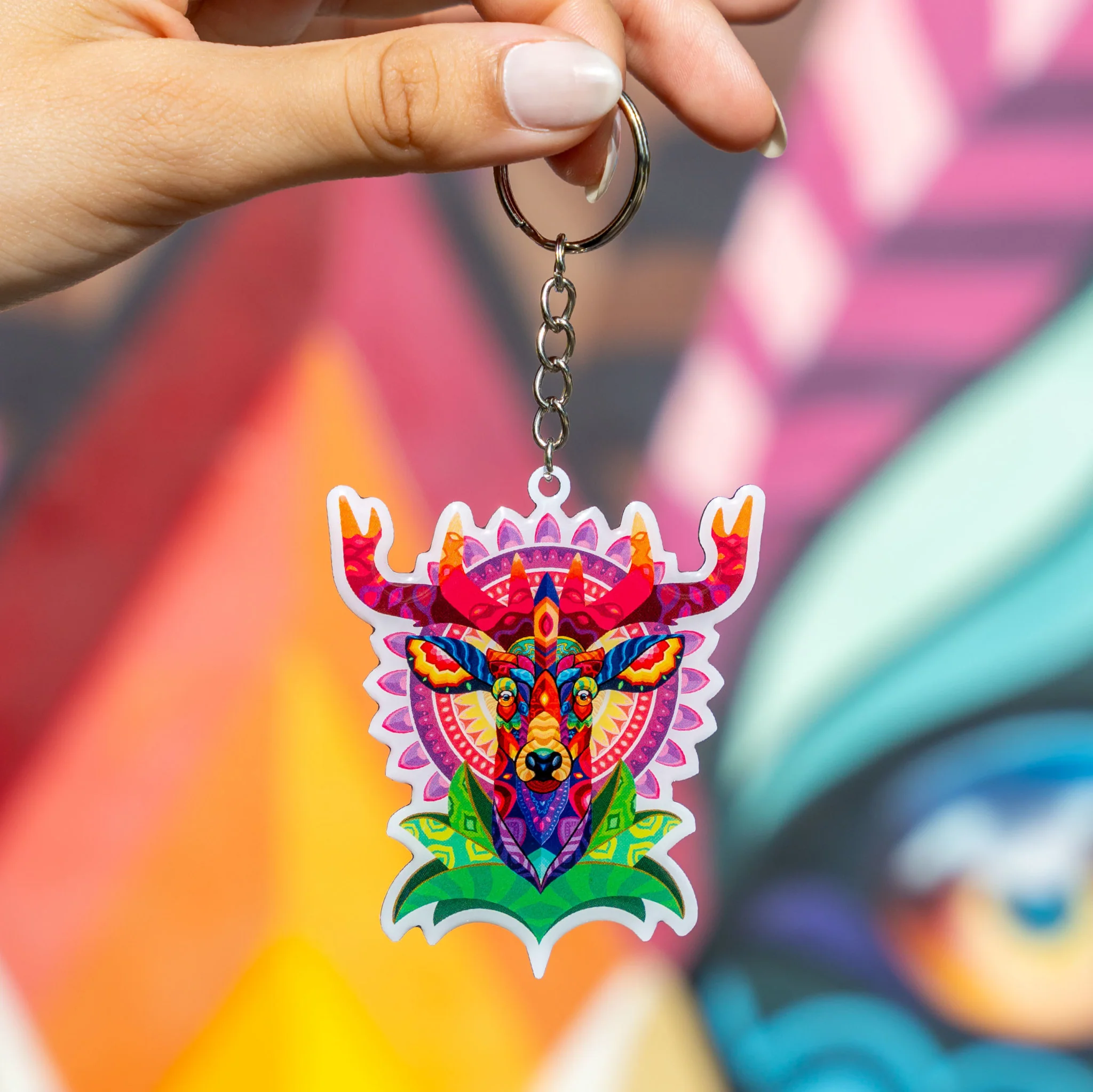 This keychain goes beyond the standard designs and embarks on a journey of artistic exploration with its vibrant CMYK printing. The keychain displays a fascinating spectrum of colors, enhanced by a glossy layer of epoxy. This artistic interpretation of Farid Rueda's Deer encapsulates the majesty and mystique of the animal, rendered in a modern, abstract style that's sure to catch the eye.