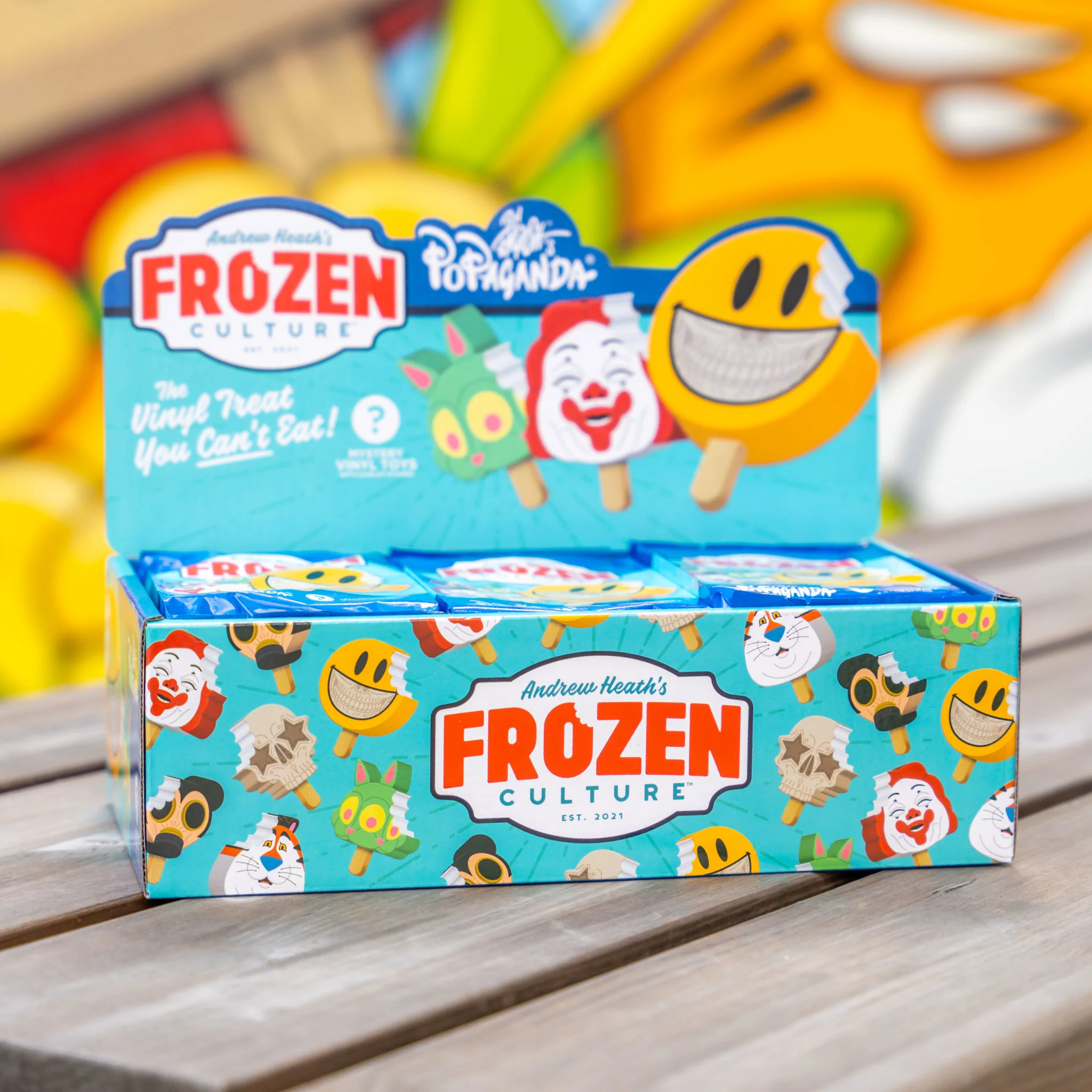3D Retro presents Frozen Culture’s Ron English Popaganda mystery vinyl toys series. These blind bag popsicles are 4.5 inches high, come with a stand, and are NOT edible.