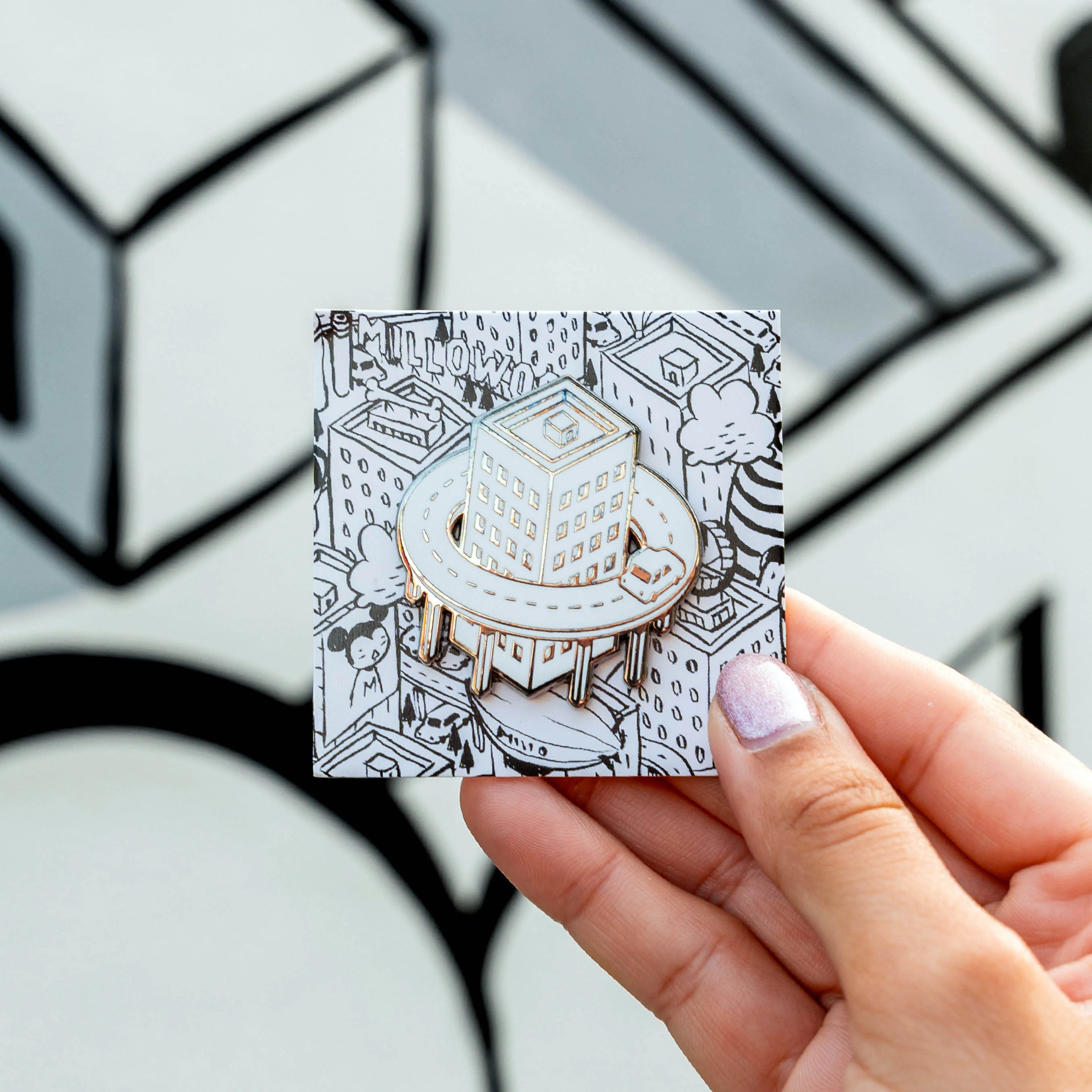 Q: What makes the MILLO HIGHWAY PIN unique? A: Its design is a direct representation of MILLO's signature urban landscape art, rendered in a wearable format.