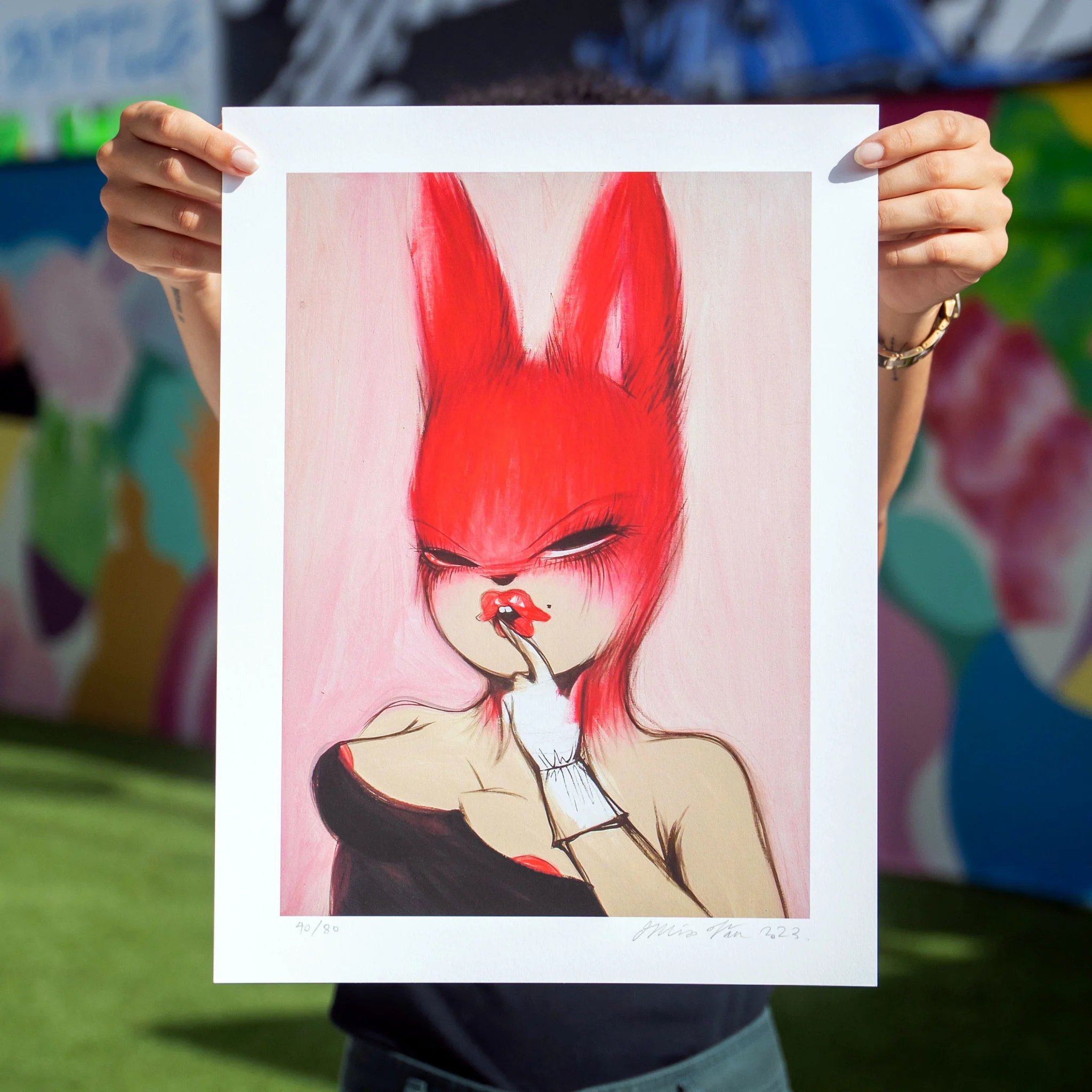 Our Miss Van "Red Bunny" print is produced on Hahnemühle Photo Rag 308gsm - renowned for its exceptional quality and durability. Measuring at 40 x 30 cm (15.75" x 11.81"), including a 3 cm (1.18") margin all around, this print radiates sophistication and artistic excellence. Carefully printed in Barcelona, it captures Miss Van's distinctive style, making every detail shine through with vivid color and striking clarity.