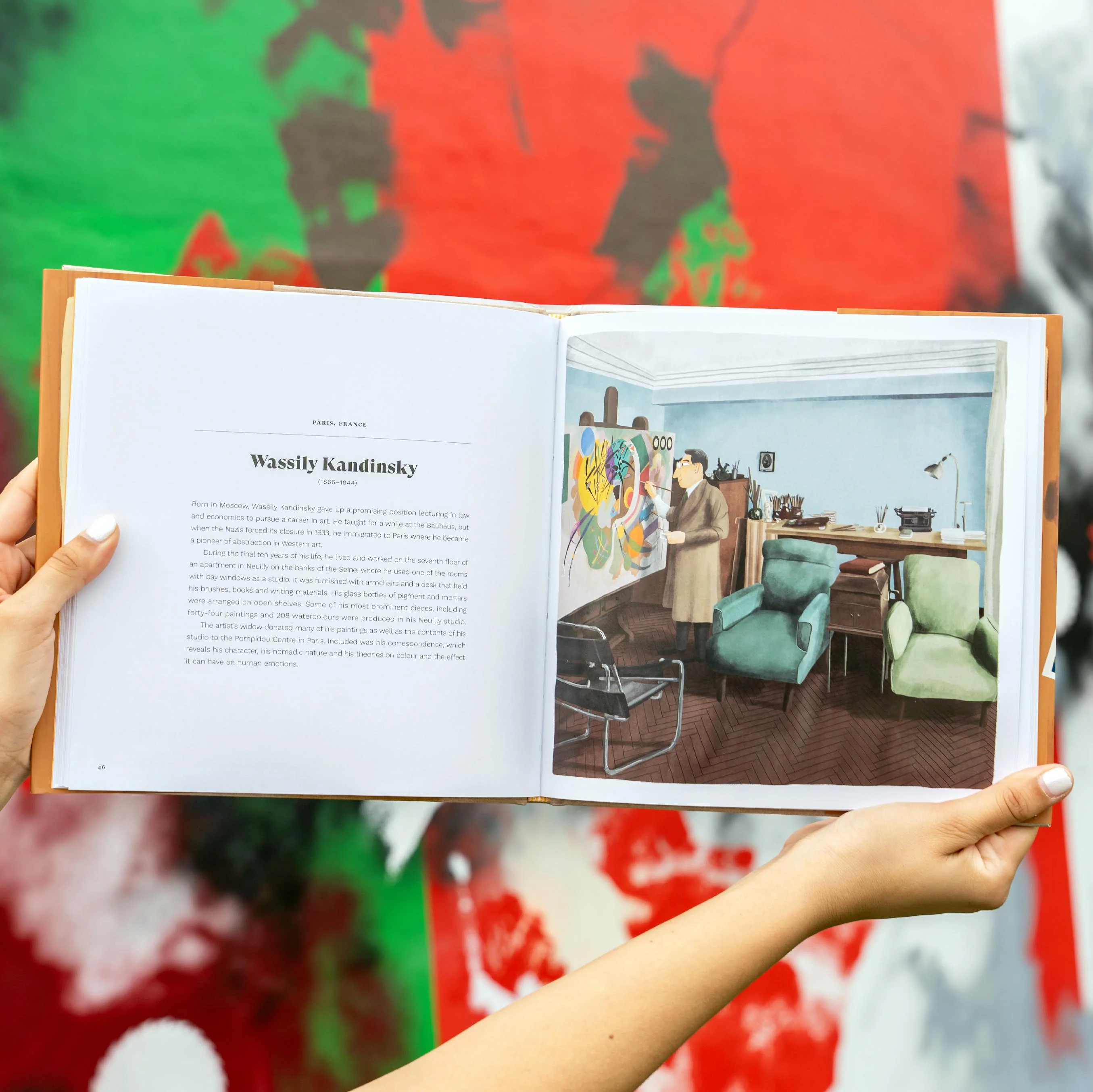 Painters of the 20th Century Painting In Their Studios features vivid illustrations celebrating influential artists in their creative spaces. The book includes a detailed layout of art supplies and palettes, immersing readers in the vibrant world of artistic expression. Key highlights include profiles of renowned painters like Wassily Kandinsky paired with stunning imagery of their studios.