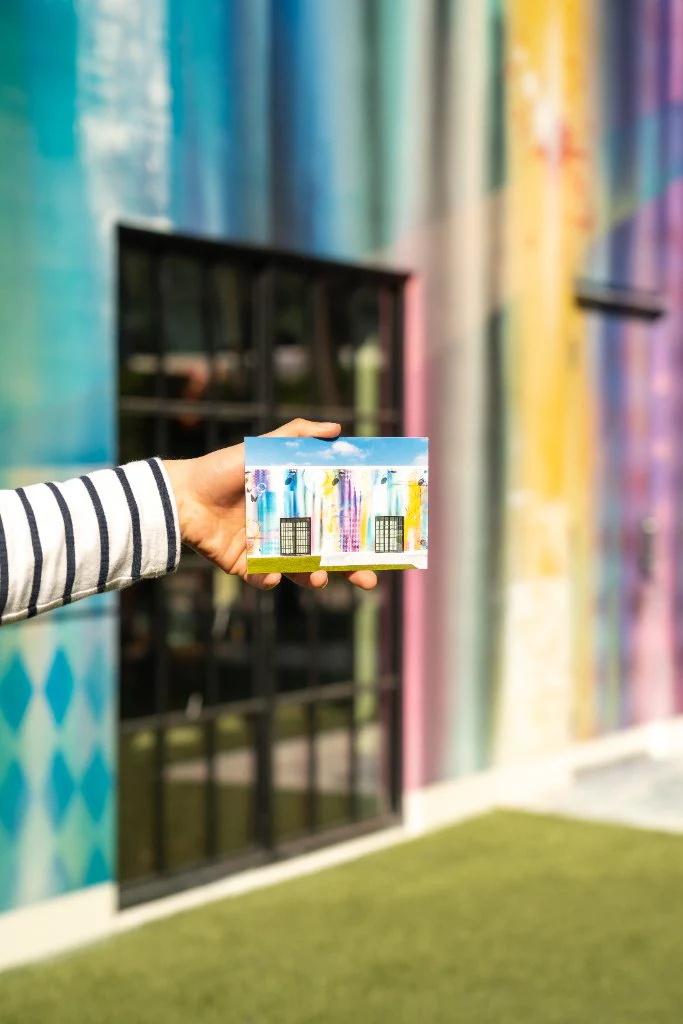 A postcard featuring a wide Risk mural washed in soft gradients of aqua, lavender, peach, and yellow, layered with halftone dots, diamond patterns, and airy spray fades. The wall is punctuated by two dark window grids and looping linework circles, with small butterflies drifting near the left edge. The reverse is clean with Wynwood Walls branding and the standard postcard layout.