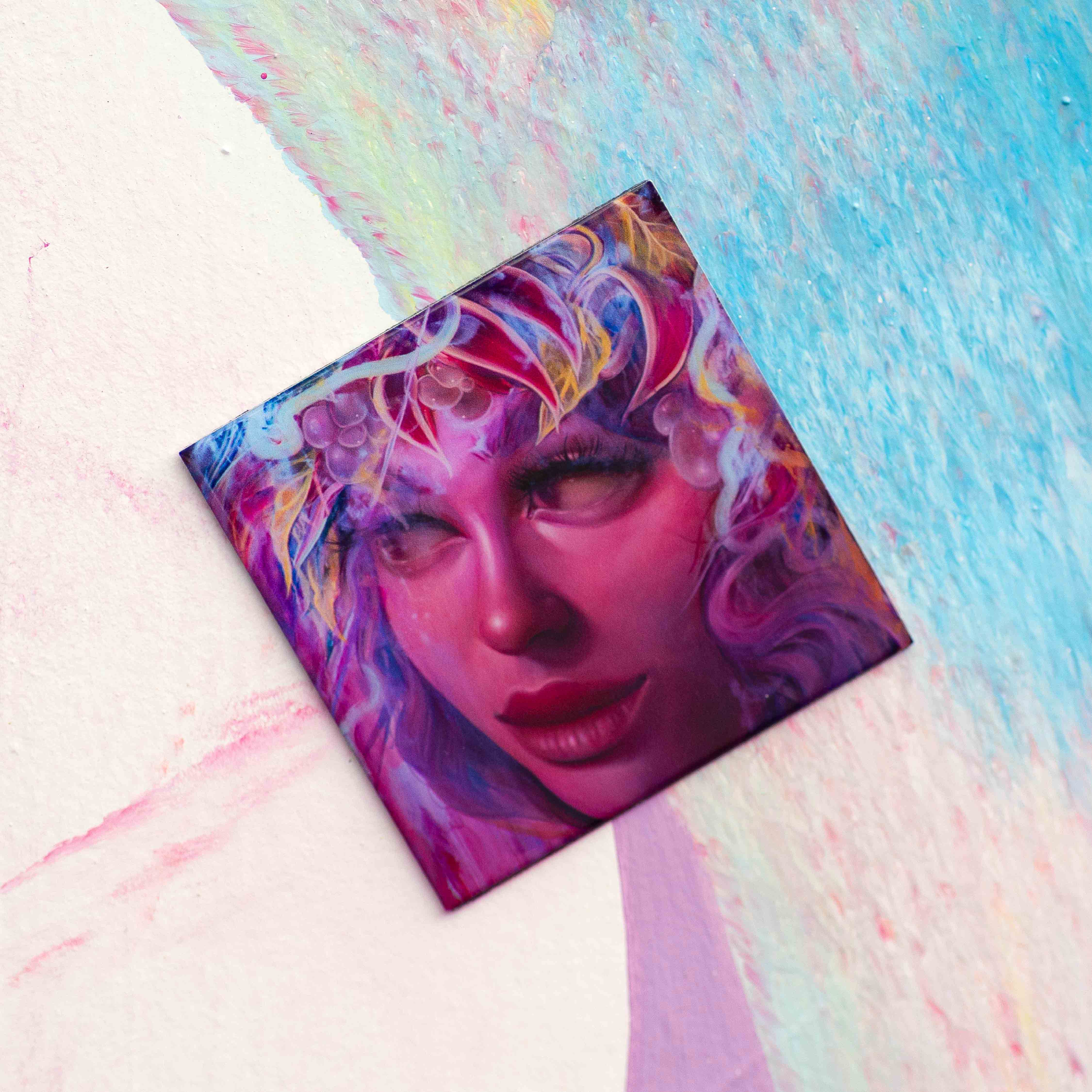 Inspired by introspection and transformation, "REFLEXA" showcases Suarez’s signature style—blending tropical palettes, surreal beauty, and delicate symbolism. Whether displayed on your fridge, studio wall, or creative space, this 3.25" x 3.25" magnet is a small yet powerful reflection of feminine energy and contemporary street art.