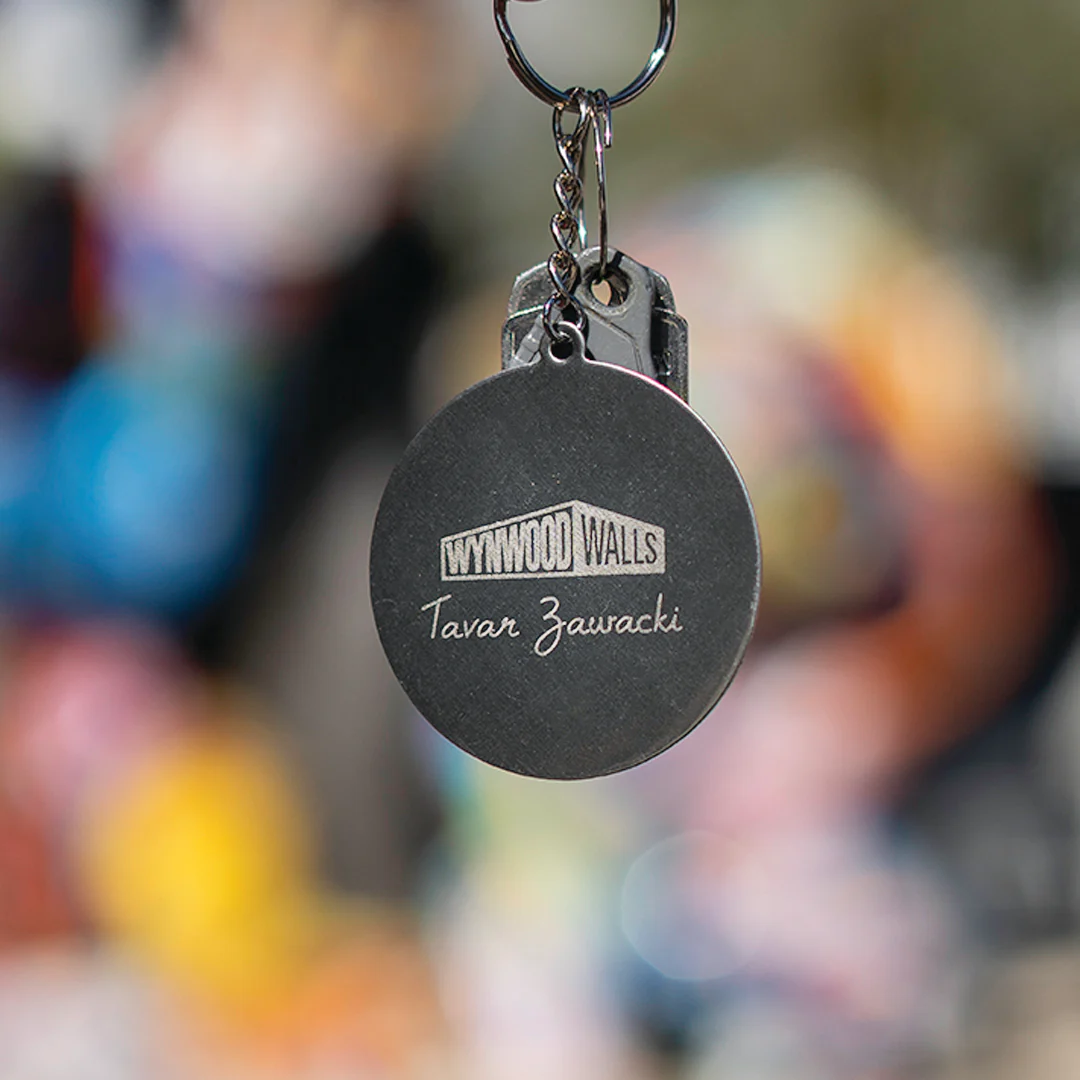 A round charm keychain built around Tavar Zawacki’s Incognito geometry. The front is a printed, high color pattern of crisp angles and layered shapes that reads fast on the move. Flip it over for a matte black back with Wynwood Walls branding and the artist’s signature, so it carries as both artwork and mark. Finished with a metal keyring, short chain, and clasp for keys, bags, or zipper pulls.