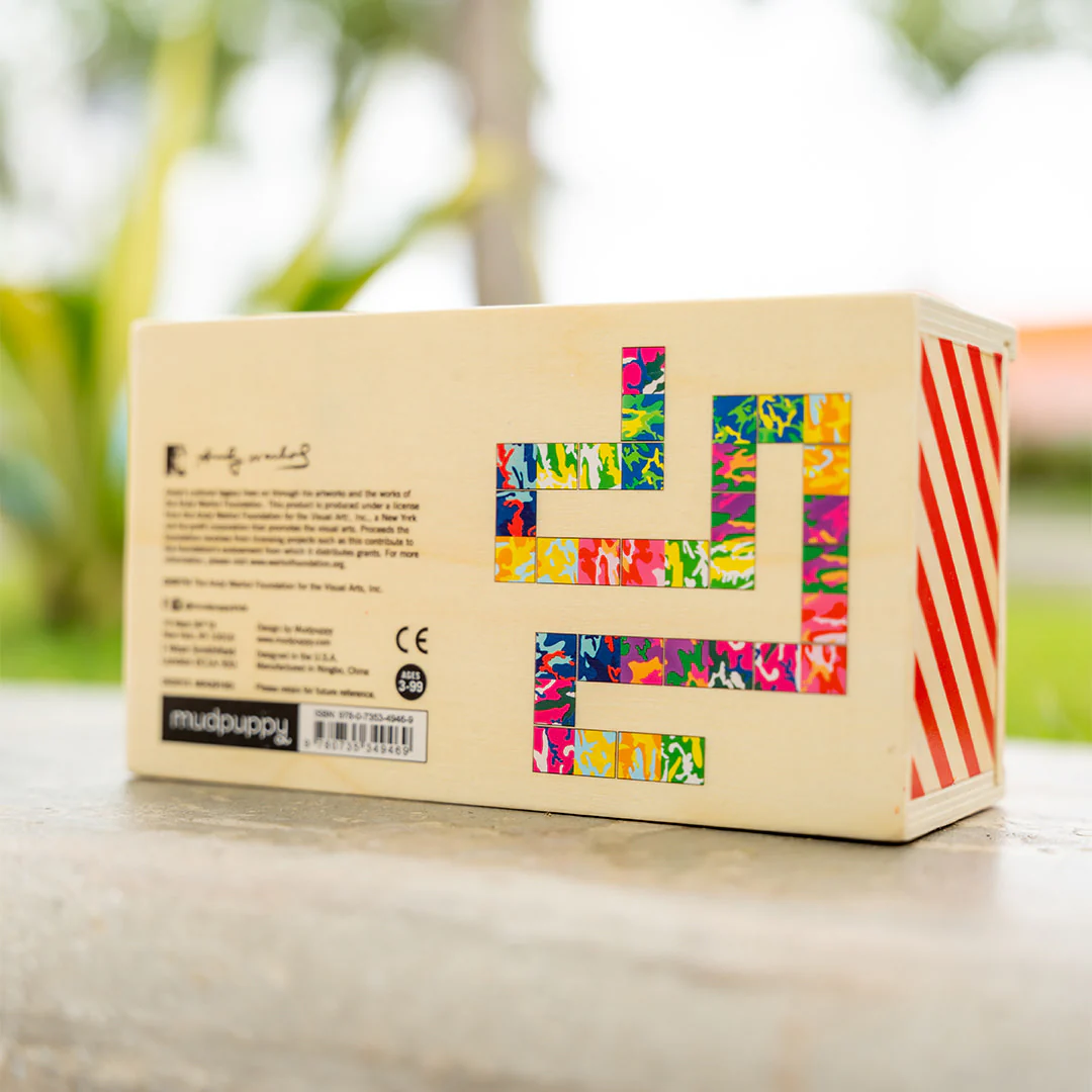 Andy Warhol Wooden Dominoes set includes 28 sturdy, wooden dominoes featuring Warhol's iconic camouflage art. This colorful way to play dominoes is very unique, just like the artist himself! The wooden box with sliding lid is perfect for storage or gifting to any Warhol fan.